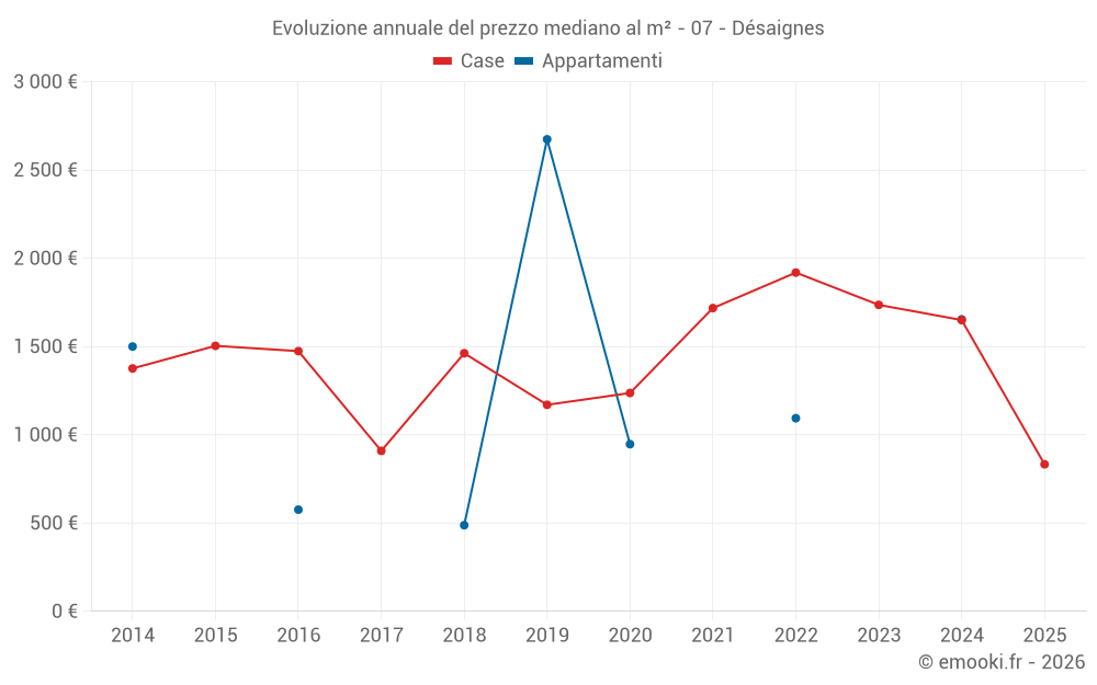 Il prezzo mediano sulle 21 transazioni di case degli ultimi 24 mesi nel comune di Désaignes era di 1 612 € al metro quadrato per un valore patrimoniale mediano di 120 000 €. In questo periodo il 60% delle transazioni era tra 900 e 2 535 € al metro quadrato (dal 2° all'8° decile).