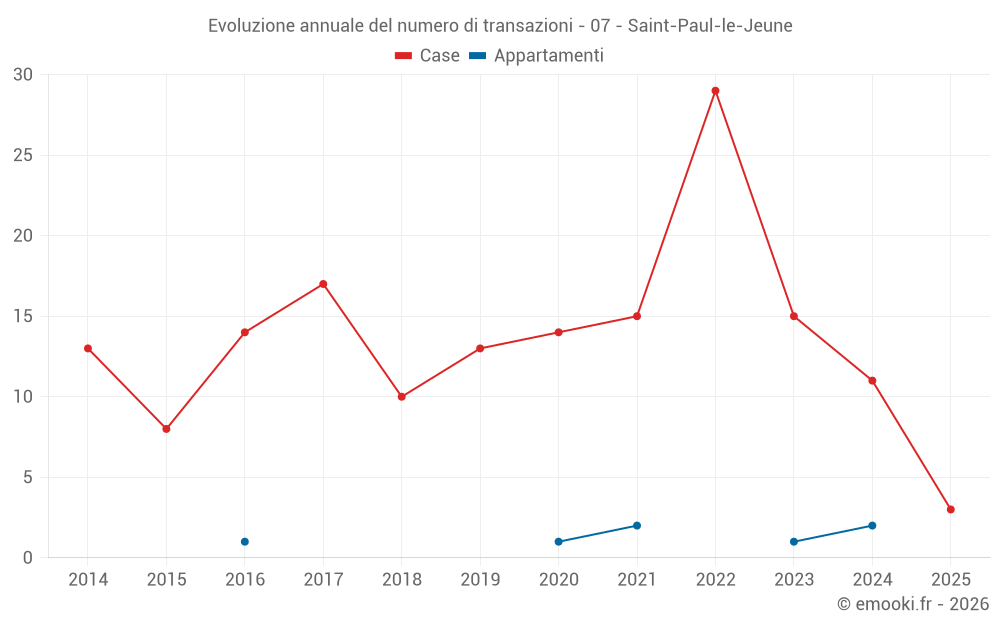 Il prezzo mediano sulle 21 transazioni di case degli ultimi 24 mesi nel comune di Saint-Paul-le-Jeune era di 1 972 € al metro quadrato per un valore patrimoniale mediano di 182 500 €. In questo periodo il 60% delle transazioni era tra 1 286 e 2 582 € al metro quadrato (dal 2° all'8° decile).