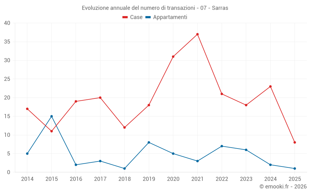 Il prezzo mediano sulle 23 transazioni di case degli ultimi 12 mesi nel comune di Sarras era di 1 915 € al metro quadrato per un valore patrimoniale mediano di 185 400 €. In questo periodo il 60% delle transazioni era tra 1 549 e 2 640 € al metro quadrato (dal 2° all'8° decile).