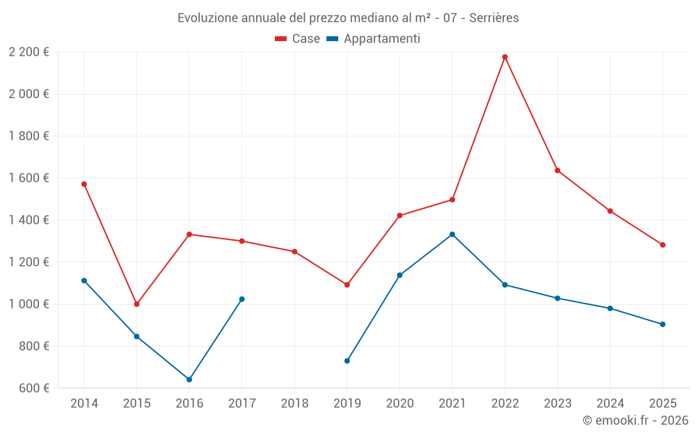 Il prezzo mediano sulle 21 transazioni di case degli ultimi 24 mesi nel comune di Serrières era di 1 327 € al metro quadrato per un valore patrimoniale mediano di 109 000 €. In questo periodo il 60% delle transazioni era tra 1 159 e 2 000 € al metro quadrato (dal 2° all'8° decile).