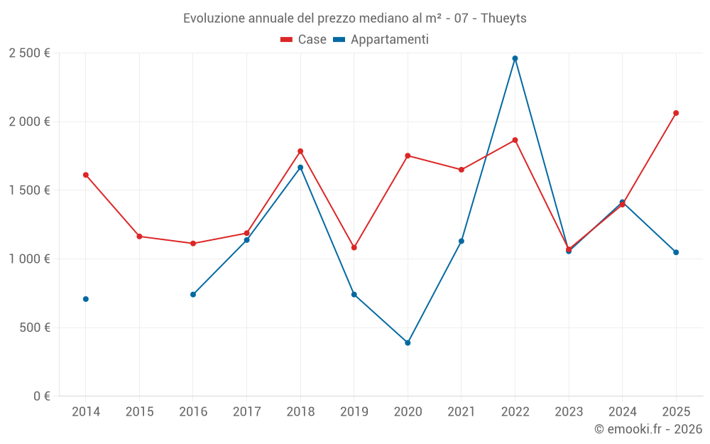 Il prezzo mediano sulle 22 transazioni di case degli ultimi 12 mesi nel comune di Thueyts era di 1 546 € al metro quadrato per un valore patrimoniale mediano di 129 425 €. In questo periodo il 60% delle transazioni era tra 943 e 2 050 € al metro quadrato (dal 2° all'8° decile).