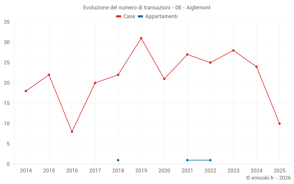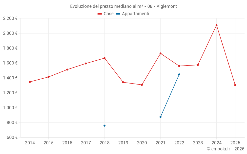 Il prezzo mediano sulle 24 transazioni di case degli ultimi 12 mesi nel comune di Aiglemont era di 1 966 € al metro quadrato per un valore patrimoniale mediano di 181 000 €. In questo periodo il 60% delle transazioni era tra 1 191 e 2 338 € al metro quadrato (dal 2° all'8° decile).