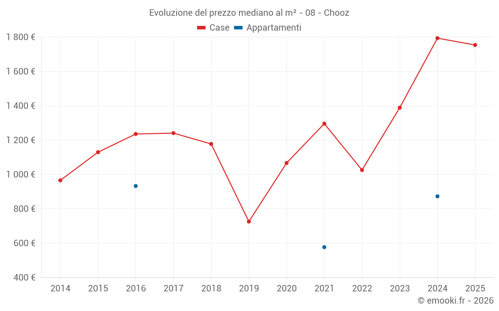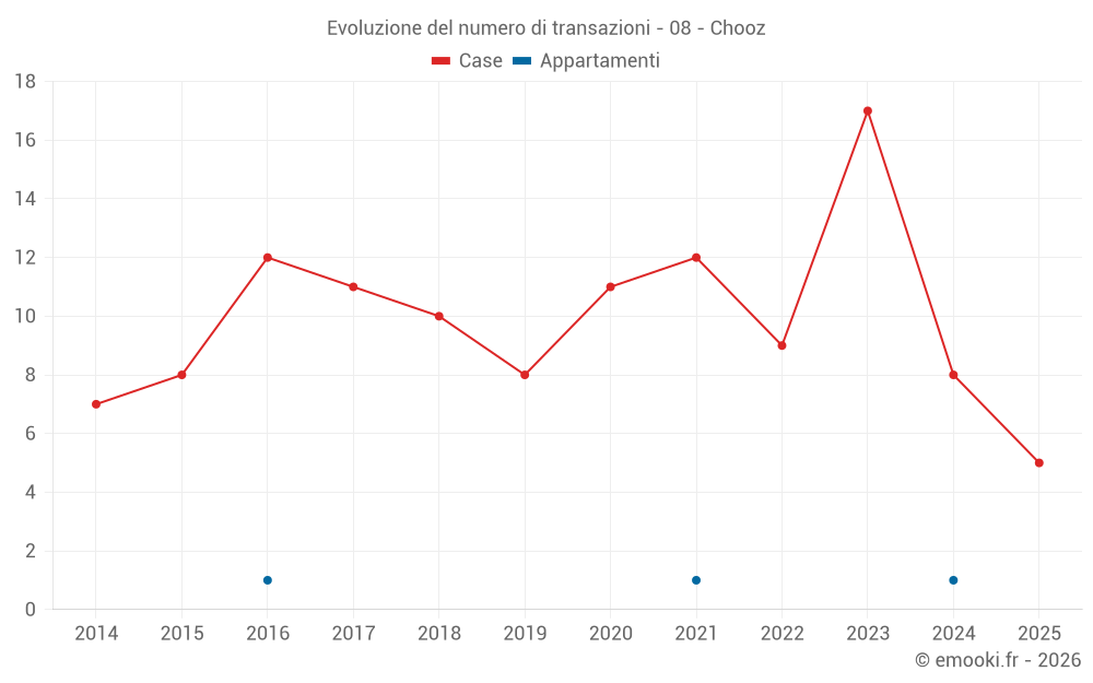 Il prezzo mediano sulle 21 transazioni di case degli ultimi 24 mesi nel comune di Chooz era di 1 678 € al metro quadrato per un valore patrimoniale mediano di 135 000 €. In questo periodo il 60% delle transazioni era tra 1 250 e 2 077 € al metro quadrato (dal 2° all'8° decile).
