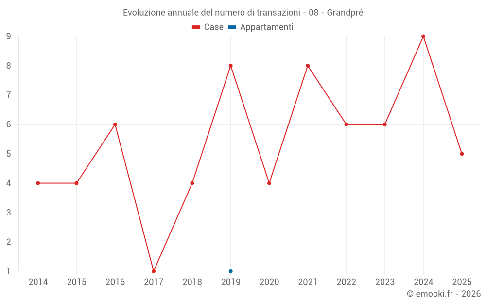 Il prezzo mediano sulle 16 transazioni di case degli ultimi 24 mesi nel comune di Grandpré era di 416 € al metro quadrato per un valore patrimoniale mediano di 36 500 €. In questo periodo il 60% delle transazioni era tra 250 e 904 € al metro quadrato (dal 2° all'8° decile).