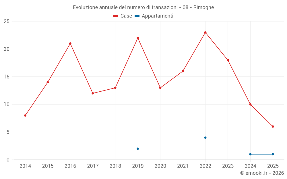 Il prezzo mediano sulle 24 transazioni di case degli ultimi 24 mesi nel comune di Rimogne era di 1 212 € al metro quadrato per un valore patrimoniale mediano di 133 500 €. In questo periodo il 60% delle transazioni era tra 666 e 1 697 € al metro quadrato (dal 2° all'8° decile).