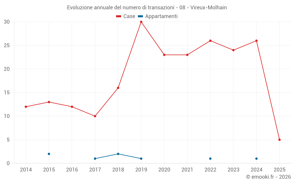 Il prezzo mediano sulle 20 transazioni di case degli ultimi 12 mesi nel comune di Vireux-Molhain era di 1 190 € al metro quadrato per un valore patrimoniale mediano di 90 000 €. In questo periodo il 60% delle transazioni era tra 614 e 1 511 € al metro quadrato (dal 2° all'8° decile).