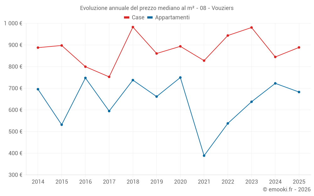 Il prezzo mediano sulle 40 transazioni di case degli ultimi 12 mesi nel comune di Vouziers era di 845 € al metro quadrato per un valore patrimoniale mediano di 77 500 €. In questo periodo il 60% delle transazioni era tra 443 e 1 237 € al metro quadrato (dal 2° all'8° decile).
