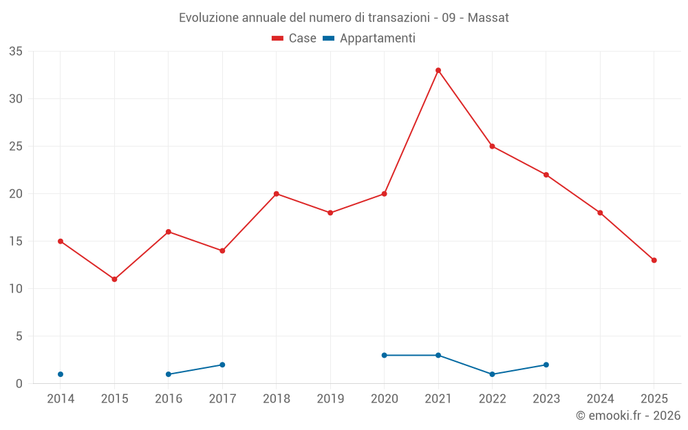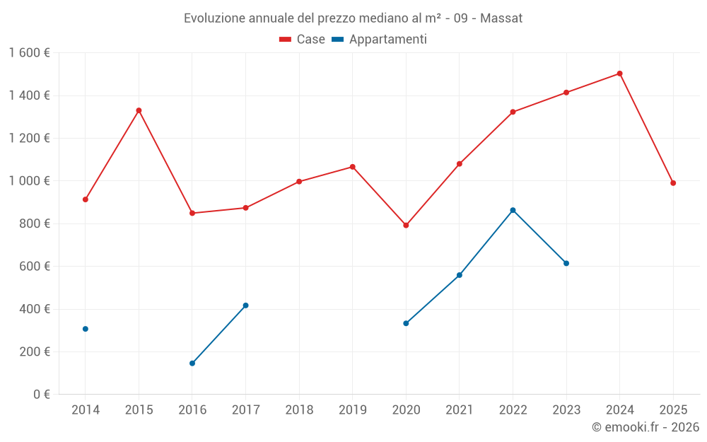 Il prezzo mediano sulle 24 transazioni di case degli ultimi 12 mesi nel comune di Massat era di 1 110 € al metro quadrato per un valore patrimoniale mediano di 64 900 €. In questo periodo il 60% delle transazioni era tra 516 e 1 899 € al metro quadrato (dal 2° all'8° decile).