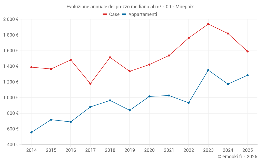 Il prezzo mediano sulle 20 transazioni di appartamenti degli ultimi 24 mesi nel comune di Mirepoix era di 1 241 € al metro quadrato per un valore patrimoniale mediano di 69 500 €. In questo periodo il 60% delle transazioni era tra 1 073 e 1 609 € al metro quadrato (dal 2° all'8° decile).