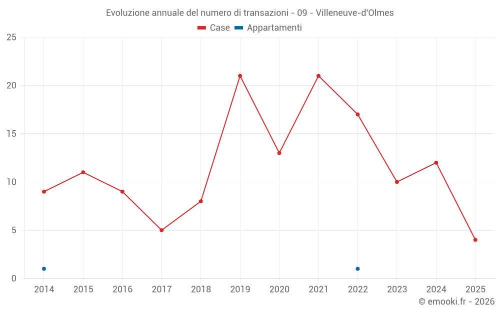 Il prezzo mediano sulle 18 transazioni di case degli ultimi 24 mesi nel comune di Villeneuve-d'Olmes era di 1 029 € al metro quadrato per un valore patrimoniale mediano di 81 250 €. In questo periodo il 60% delle transazioni era tra 520 e 1 346 € al metro quadrato (dal 2° all'8° decile).