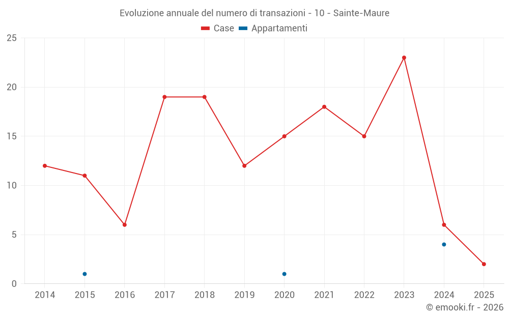 Il prezzo mediano sulle 18 transazioni di case degli ultimi 24 mesi nel comune di Sainte-Maure era di 2 072 € al metro quadrato per un valore patrimoniale mediano di 241 500 €. In questo periodo il 60% delle transazioni era tra 1 780 e 2 604 € al metro quadrato (dal 2° all'8° decile).