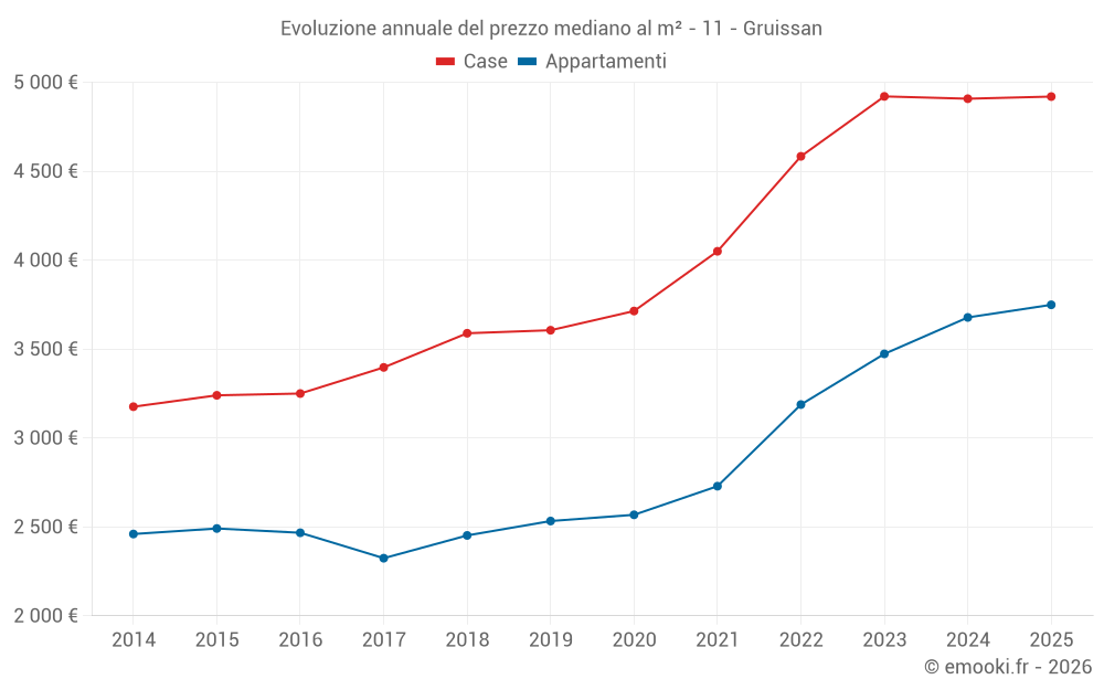 Il prezzo mediano sulle 29 transazioni di case degli ultimi 3 mesi nel comune di Gruissan era di 5 422 € al metro quadrato per un valore patrimoniale mediano di 198 315 €. In questo periodo il 60% delle transazioni era tra 4 346 e 5 909 € al metro quadrato (dal 2° all'8° decile).