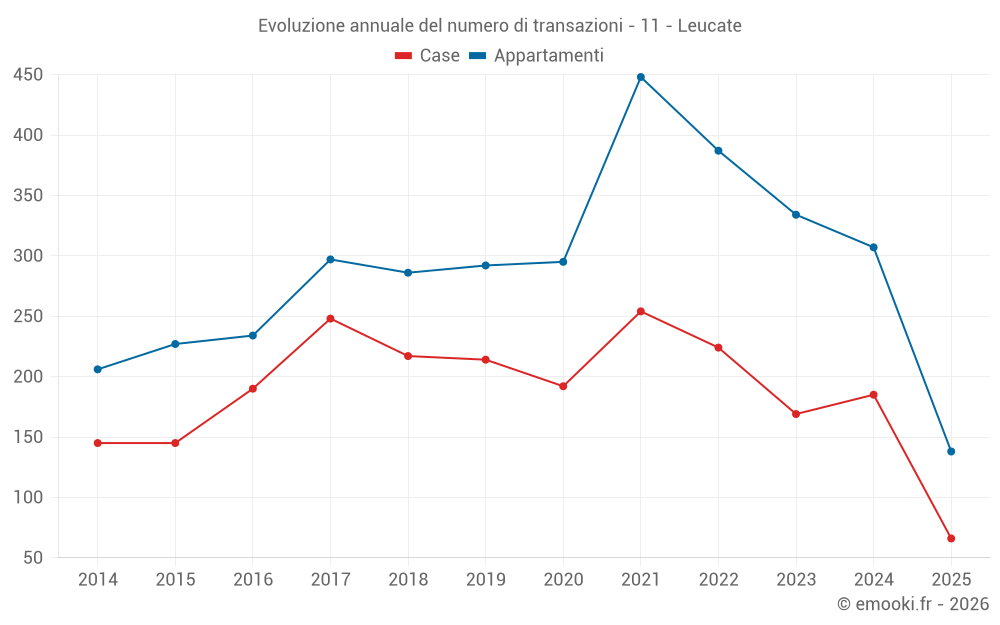 Il prezzo mediano sulle 57 transazioni di appartamenti degli ultimi 3 mesi nel comune di Leucate era di 3 315 € al metro quadrato per un valore patrimoniale mediano di 85 500 €. In questo periodo il 60% delle transazioni era tra 2 648 e 4 148 € al metro quadrato (dal 2° all'8° decile).