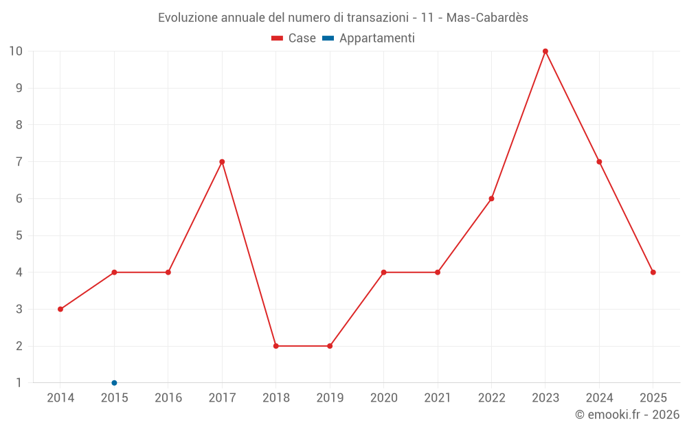 Il prezzo mediano sulle 15 transazioni di case degli ultimi 24 mesi nel comune di Mas-Cabardès era di 786 € al metro quadrato per un valore patrimoniale mediano di 45 000 €. In questo periodo il 60% delle transazioni era tra 450 e 1 358 € al metro quadrato (dal 2° all'8° decile).