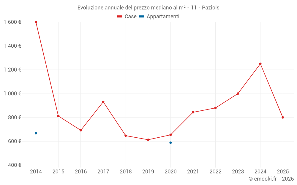 Il prezzo mediano sulle 20 transazioni di case degli ultimi 24 mesi nel comune di Paziols era di 1 003 € al metro quadrato per un valore patrimoniale mediano di 82 500 €. In questo periodo il 60% delle transazioni era tra 546 e 1 333 € al metro quadrato (dal 2° all'8° decile).