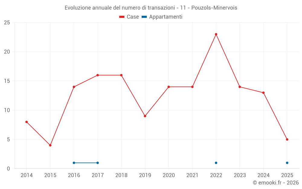 Il prezzo mediano sulle 27 transazioni di case degli ultimi 24 mesi nel comune di Pouzols-Minervois era di 2 223 € al metro quadrato per un valore patrimoniale mediano di 229 000 €. In questo periodo il 60% delle transazioni era tra 786 e 2 749 € al metro quadrato (dal 2° all'8° decile).