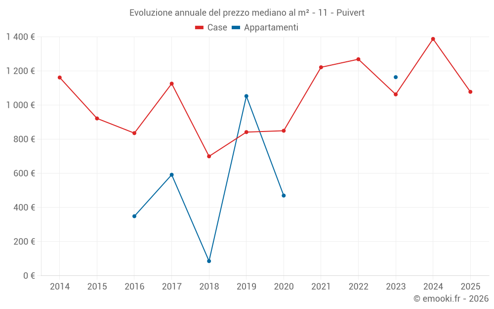 Il prezzo mediano sulle 25 transazioni di case degli ultimi 24 mesi nel comune di Puivert era di 1 342 € al metro quadrato per un valore patrimoniale mediano di 100 000 €. In questo periodo il 60% delle transazioni era tra 964 e 1 516 € al metro quadrato (dal 2° all'8° decile).