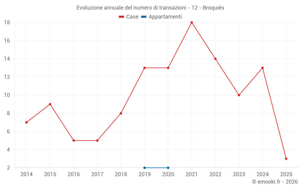 Il prezzo mediano sulle 21 transazioni di case degli ultimi 24 mesi nel comune di Broquiès era di 1 618 € al metro quadrato per un valore patrimoniale mediano di 109 000 €. In questo periodo il 60% delle transazioni era tra 805 e 2 668 € al metro quadrato (dal 2° all'8° decile).