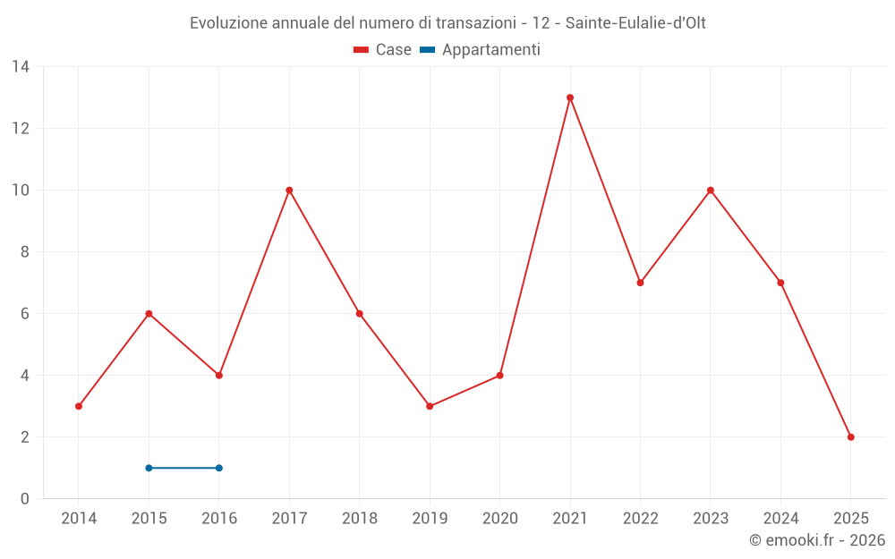 Il prezzo mediano sulle 14 transazioni di case degli ultimi 24 mesi nel comune di Sainte-Eulalie-d'Olt era di 1 240 € al metro quadrato per un valore patrimoniale mediano di 107 302 €. In questo periodo il 60% delle transazioni era tra 766 e 1 805 € al metro quadrato (dal 2° all'8° decile).