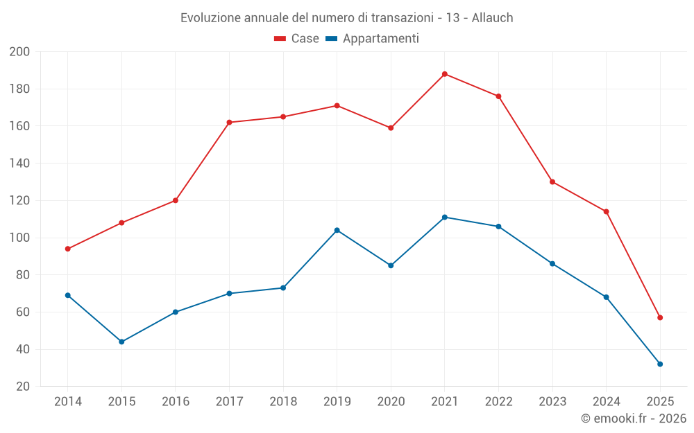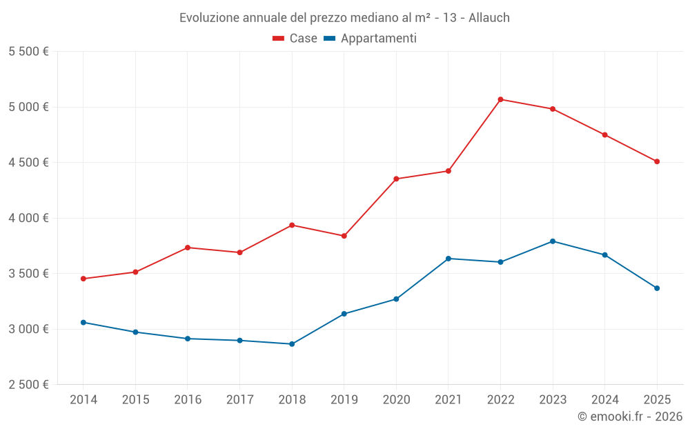 Il prezzo mediano sulle 22 transazioni di case degli ultimi 3 mesi nel comune di Allauch era di 4 725 € al metro quadrato per un valore patrimoniale mediano di 464 975 €. In questo periodo il 60% delle transazioni era tra 3 787 e 5 491 € al metro quadrato (dal 2° all'8° decile).