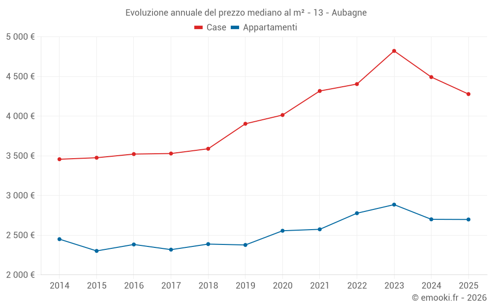 Il prezzo mediano sulle 28 transazioni di case degli ultimi 3 mesi nel comune di Aubagne era di 4 170 € al metro quadrato per un valore patrimoniale mediano di 467 650 €. In questo periodo il 60% delle transazioni era tra 3 165 e 5 494 € al metro quadrato (dal 2° all'8° decile).