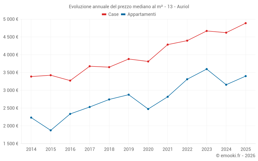 Il prezzo mediano sulle 28 transazioni di case degli ultimi 6 mesi nel comune di Auriol era di 4 889 € al metro quadrato per un valore patrimoniale mediano di 432 460 €. In questo periodo il 60% delle transazioni era tra 3 309 e 5 605 € al metro quadrato (dal 2° all'8° decile).
