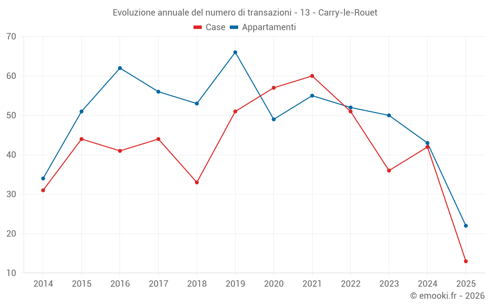 Il prezzo mediano sulle 22 transazioni di appartamenti degli ultimi 6 mesi nel comune di Carry-le-Rouet era di 5 908 € al metro quadrato per un valore patrimoniale mediano di 261 350 €. In questo periodo il 60% delle transazioni era tra 4 523 e 6 592 € al metro quadrato (dal 2° all'8° decile).