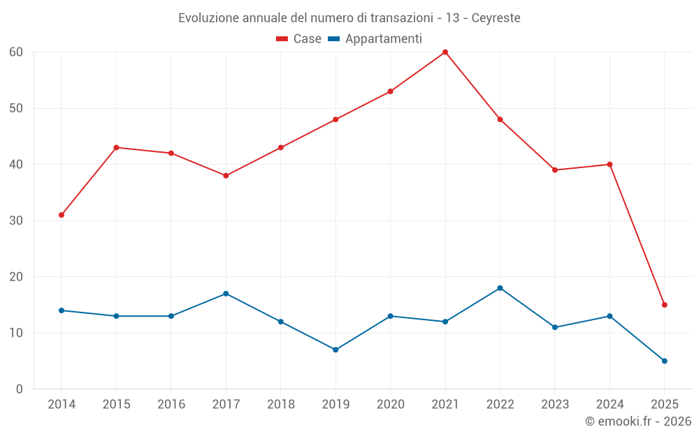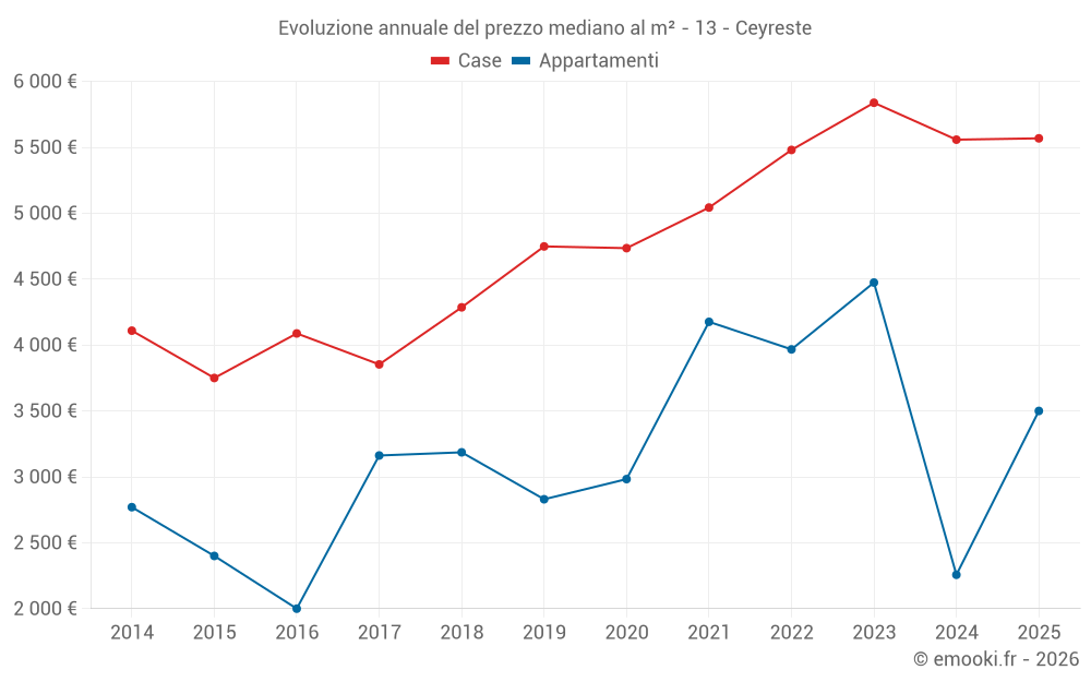 Il prezzo mediano sulle 25 transazioni di appartamenti degli ultimi 24 mesi nel comune di Ceyreste era di 2 778 € al metro quadrato per un valore patrimoniale mediano di 177 000 €. In questo periodo il 60% delle transazioni era tra 1 826 e 4 579 € al metro quadrato (dal 2° all'8° decile).