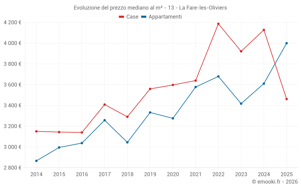 Il prezzo mediano sulle 26 transazioni di appartamenti degli ultimi 12 mesi nel comune di La Fare-les-Oliviers era di 3 617 € al metro quadrato per un valore patrimoniale mediano di 176 300 €. In questo periodo il 60% delle transazioni era tra 2 422 e 4 425 € al metro quadrato (dal 2° all'8° decile).