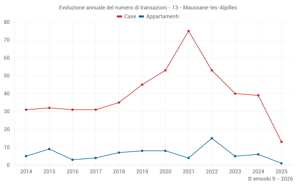 Il prezzo mediano sulle 34 transazioni di case degli ultimi 12 mesi nel comune di Maussane-les-Alpilles era di 5 478 € al metro quadrato per un valore patrimoniale mediano di 494 525 €. In questo periodo il 60% delle transazioni era tra 4 135 e 8 414 € al metro quadrato (dal 2° all'8° decile).