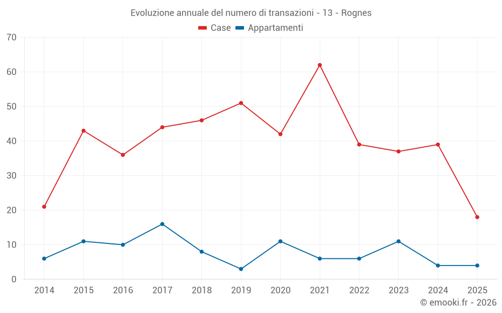 Il prezzo mediano sulle 18 transazioni di case degli ultimi 6 mesi nel comune di Rognes era di 4 552 € al metro quadrato per un valore patrimoniale mediano di 455 750 €. In questo periodo il 60% delle transazioni era tra 2 619 e 6 002 € al metro quadrato (dal 2° all'8° decile).