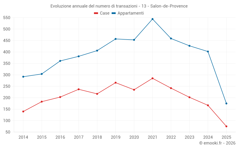 Il prezzo mediano sulle 71 transazioni di appartamenti degli ultimi 3 mesi nel comune di Salon-de-Provence era di 3 113 € al metro quadrato per un valore patrimoniale mediano di 135 350 €. In questo periodo il 60% delle transazioni era tra 2 156 e 3 714 € al metro quadrato (dal 2° all'8° decile).