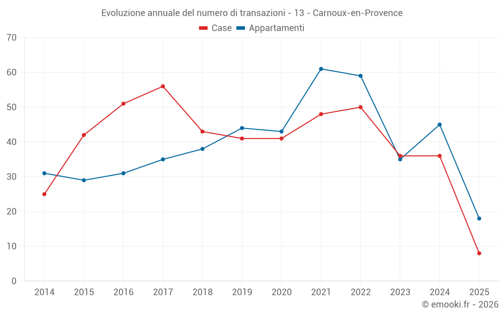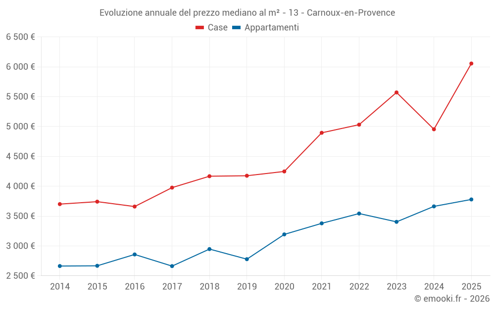 Il prezzo mediano sulle 31 transazioni di case degli ultimi 12 mesi nel comune di Carnoux-en-Provence era di 4 875 € al metro quadrato per un valore patrimoniale mediano di 571 500 €. In questo periodo il 60% delle transazioni era tra 4 261 e 6 141 € al metro quadrato (dal 2° all'8° decile).