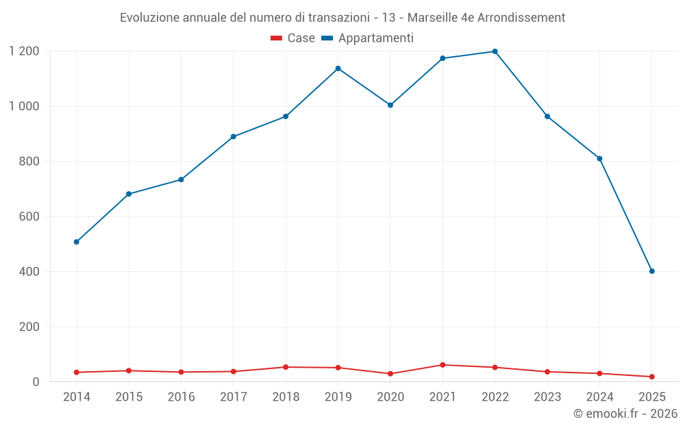 Il prezzo mediano sulle 19 transazioni di case degli ultimi 6 mesi nel comune di Marseille 4e Arrondissement era di 3 816 € al metro quadrato per un valore patrimoniale mediano di 329 000 €. In questo periodo il 60% delle transazioni era tra 2 445 e 5 397 € al metro quadrato (dal 2° all'8° decile).