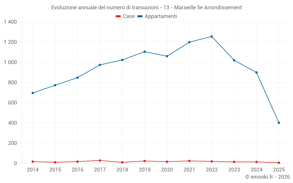 Il prezzo mediano sulle 190 transazioni di appartamenti degli ultimi 3 mesi nel comune di Marseille 5e Arrondissement era di 3 376 € al metro quadrato per un valore patrimoniale mediano di 152 500 €. In questo periodo il 60% delle transazioni era tra 2 605 e 4 126 € al metro quadrato (dal 2° all'8° decile).