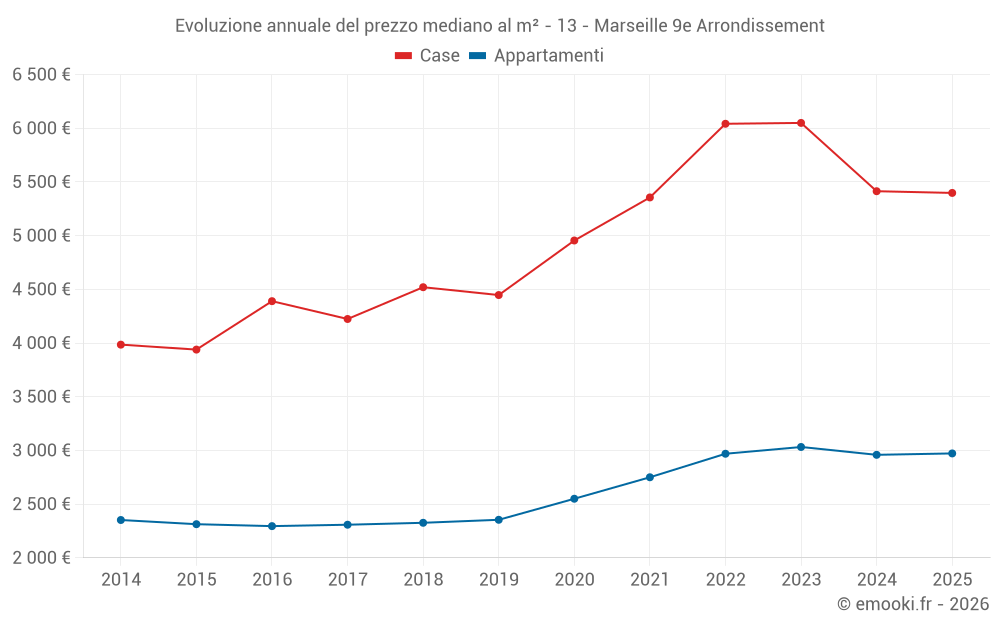 Il prezzo mediano sulle 50 transazioni di case degli ultimi 6 mesi nel comune di Marseille 9e Arrondissement era di 5 398 € al metro quadrato per un valore patrimoniale mediano di 517 867 €. In questo periodo il 60% delle transazioni era tra 3 768 e 7 247 € al metro quadrato (dal 2° all'8° decile).