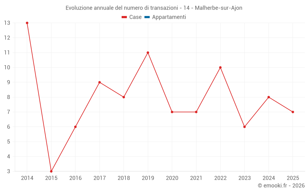 Il prezzo mediano sulle 18 transazioni di case degli ultimi 24 mesi nel comune di Malherbe-sur-Ajon era di 1 742 € al metro quadrato per un valore patrimoniale mediano di 178 500 €. In questo periodo il 60% delle transazioni era tra 1 204 e 2 137 € al metro quadrato (dal 2° all'8° decile).