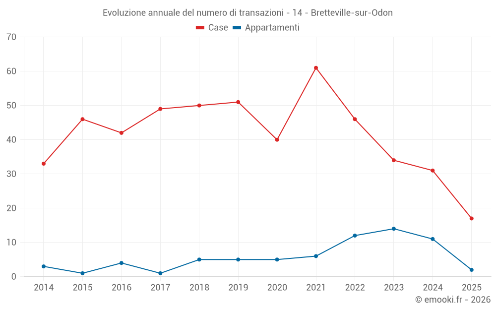 Il prezzo mediano sulle 35 transazioni di case degli ultimi 12 mesi nel comune di Bretteville-sur-Odon era di 2 929 € al metro quadrato per un valore patrimoniale mediano di 300 000 €. In questo periodo il 60% delle transazioni era tra 2 440 e 3 525 € al metro quadrato (dal 2° all'8° decile).