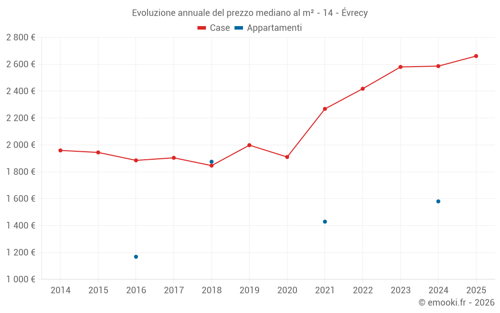 Il prezzo mediano sulle 18 transazioni di case degli ultimi 12 mesi nel comune di Évrecy era di 2 816 € al metro quadrato per un valore patrimoniale mediano di 232 500 €. In questo periodo il 60% delle transazioni era tra 2 201 e 2 930 € al metro quadrato (dal 2° all'8° decile).