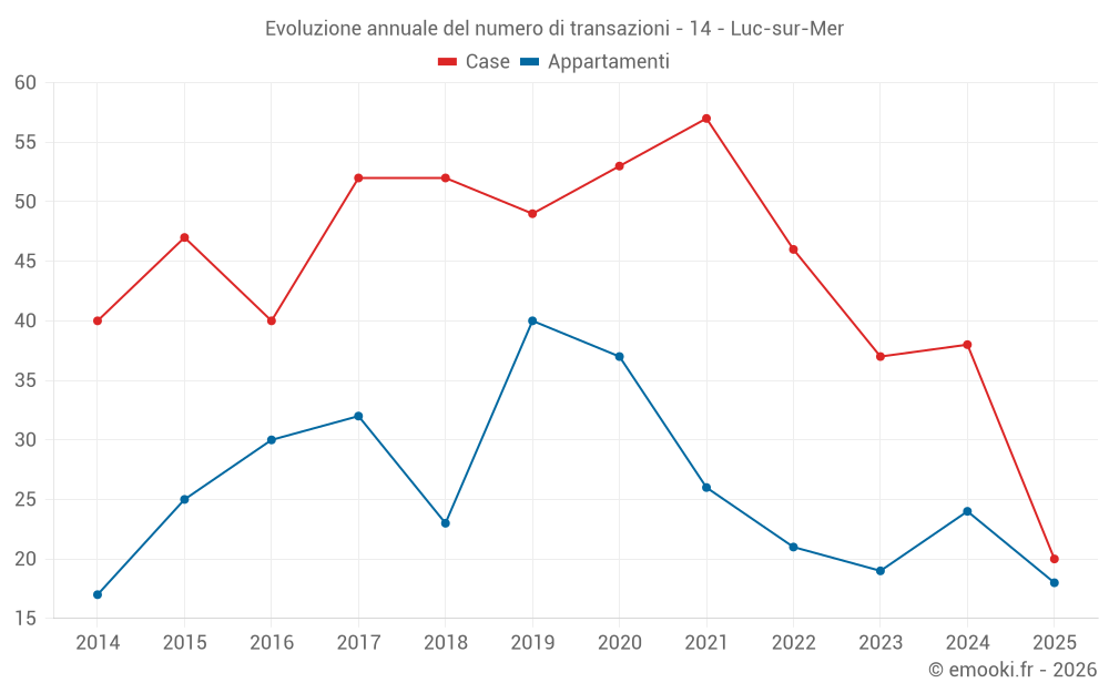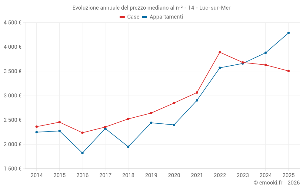 Il prezzo mediano sulle 18 transazioni di appartamenti degli ultimi 6 mesi nel comune di Luc-sur-Mer era di 4 287 € al metro quadrato per un valore patrimoniale mediano di 256 240 €. In questo periodo il 60% delle transazioni era tra 2 793 e 5 902 € al metro quadrato (dal 2° all'8° decile).