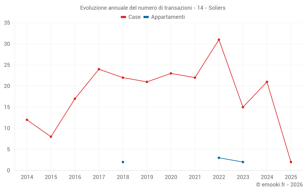 Il prezzo mediano sulle 30 transazioni di case degli ultimi 24 mesi nel comune di Soliers era di 2 684 € al metro quadrato per un valore patrimoniale mediano di 263 800 €. In questo periodo il 60% delle transazioni era tra 2 318 e 2 992 € al metro quadrato (dal 2° all'8° decile).