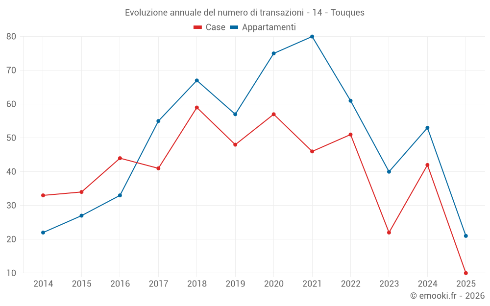 Il prezzo mediano sulle 21 transazioni di appartamenti degli ultimi 6 mesi nel comune di Touques era di 3 500 € al metro quadrato per un valore patrimoniale mediano di 137 000 €. In questo periodo il 60% delle transazioni era tra 3 000 e 4 189 € al metro quadrato (dal 2° all'8° decile).