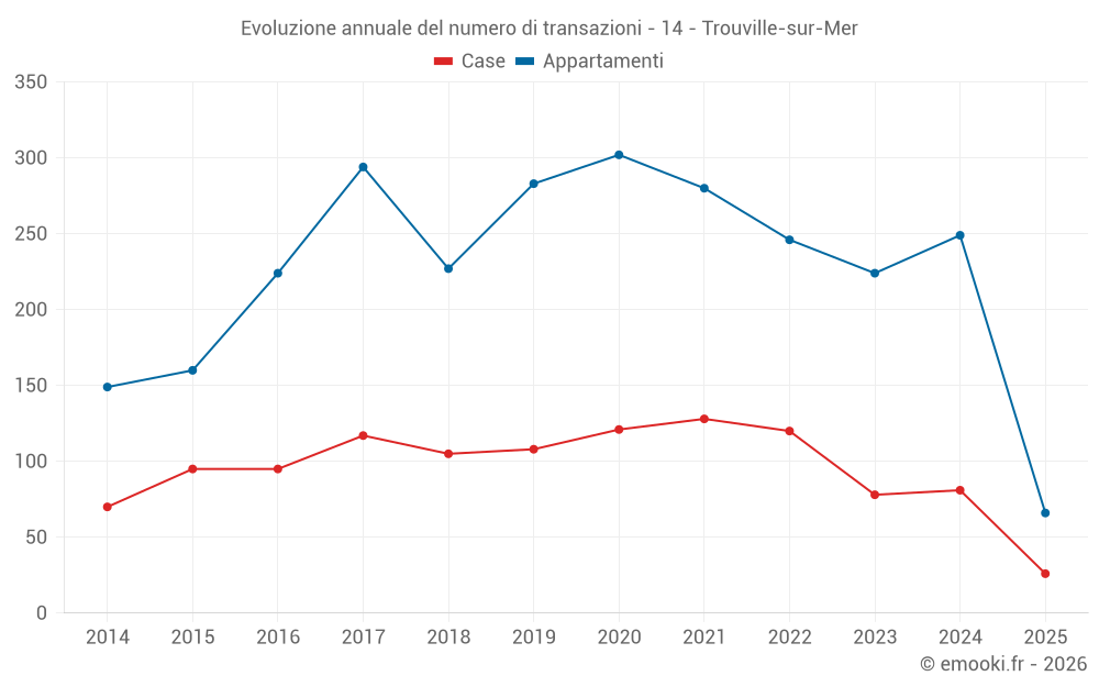 Il prezzo mediano sulle 30 transazioni di appartamenti degli ultimi 3 mesi nel comune di Trouville-sur-Mer era di 5 638 € al metro quadrato per un valore patrimoniale mediano di 215 750 €. In questo periodo il 60% delle transazioni era tra 4 038 e 6 635 € al metro quadrato (dal 2° all'8° decile).