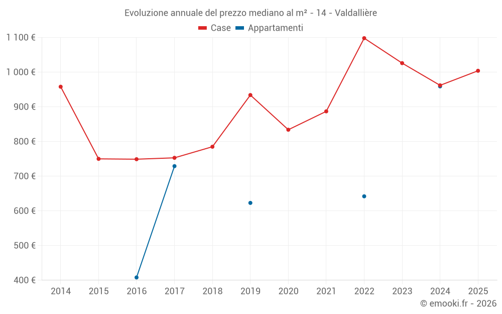 Il prezzo mediano sulle 26 transazioni di case degli ultimi 6 mesi nel comune di Valdallière era di 1 004 € al metro quadrato per un valore patrimoniale mediano di 118 500 €. In questo periodo il 60% delle transazioni era tra 525 e 1 638 € al metro quadrato (dal 2° all'8° decile).