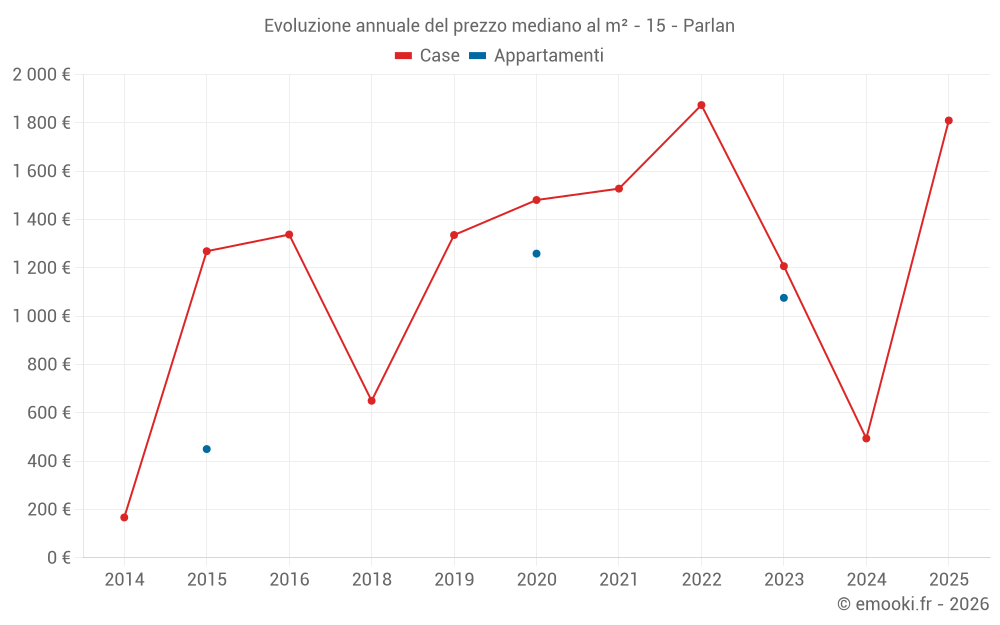 Il prezzo mediano sulle 15 transazioni di case degli ultimi 24 mesi nel comune di Parlan era di 1 286 € al metro quadrato per un valore patrimoniale mediano di 111 879 €. In questo periodo il 60% delle transazioni era tra 439 e 1 841 € al metro quadrato (dal 2° all'8° decile).