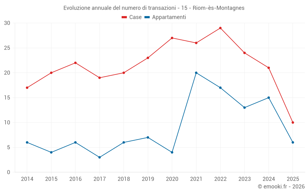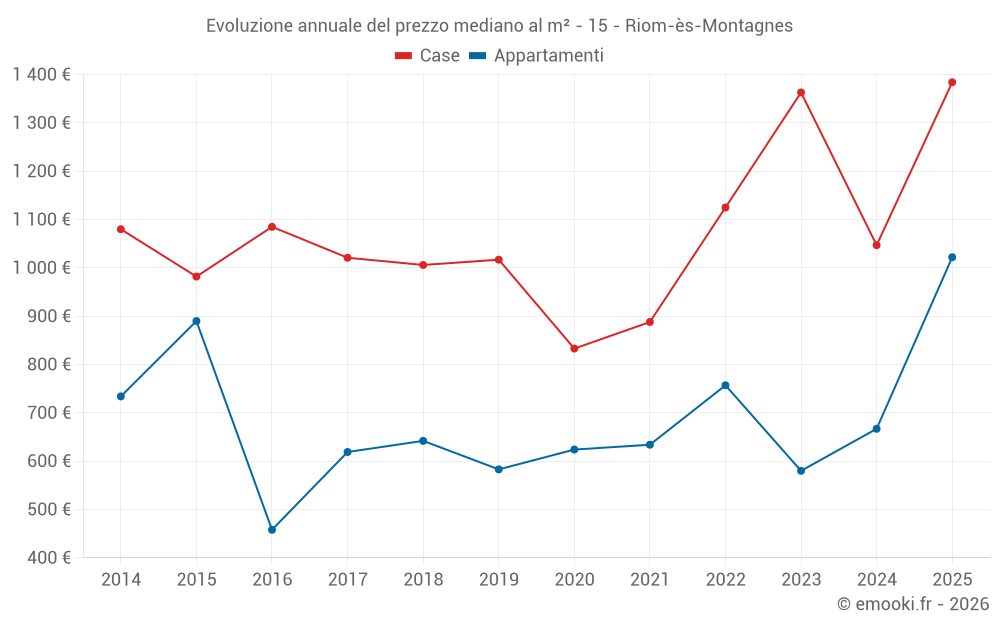 Il prezzo mediano sulle 17 transazioni di appartamenti degli ultimi 12 mesi nel comune di Riom-ès-Montagnes era di 862 € al metro quadrato per un valore patrimoniale mediano di 42 000 €. In questo periodo il 60% delle transazioni era tra 653 e 1 165 € al metro quadrato (dal 2° all'8° decile).