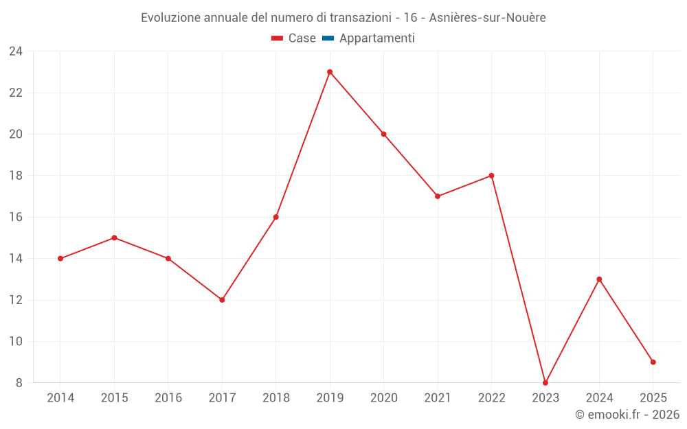 Il prezzo mediano sulle 25 transazioni di case degli ultimi 24 mesi nel comune di Asnières-sur-Nouère era di 1 632 € al metro quadrato per un valore patrimoniale mediano di 181 100 €. In questo periodo il 60% delle transazioni era tra 856 e 2 185 € al metro quadrato (dal 2° all'8° decile).