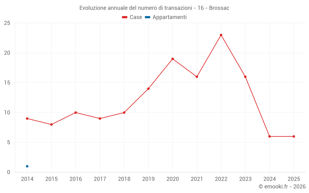 Il prezzo mediano sulle 19 transazioni di case degli ultimi 24 mesi nel comune di Brossac era di 907 € al metro quadrato per un valore patrimoniale mediano di 90 000 €. In questo periodo il 60% delle transazioni era tra 523 e 1 621 € al metro quadrato (dal 2° all'8° decile).