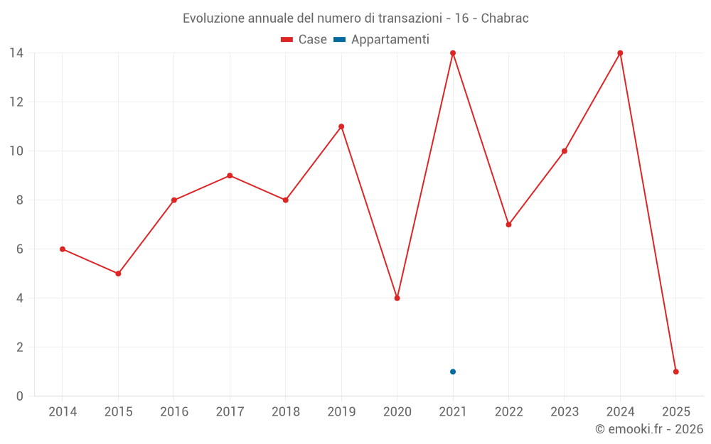 Il prezzo mediano sulle 19 transazioni di case degli ultimi 24 mesi nel comune di Chabrac era di 1 000 € al metro quadrato per un valore patrimoniale mediano di 80 000 €. In questo periodo il 60% delle transazioni era tra 460 e 1 477 € al metro quadrato (dal 2° all'8° decile).