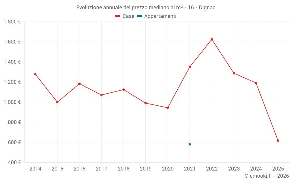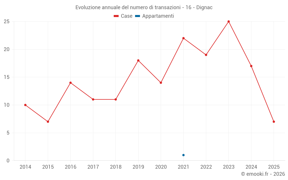 Il prezzo mediano sulle 16 transazioni di case degli ultimi 12 mesi nel comune di Dignac era di 1 094 € al metro quadrato per un valore patrimoniale mediano di 121 996 €. In questo periodo il 60% delle transazioni era tra 435 e 1 684 € al metro quadrato (dal 2° all'8° decile).